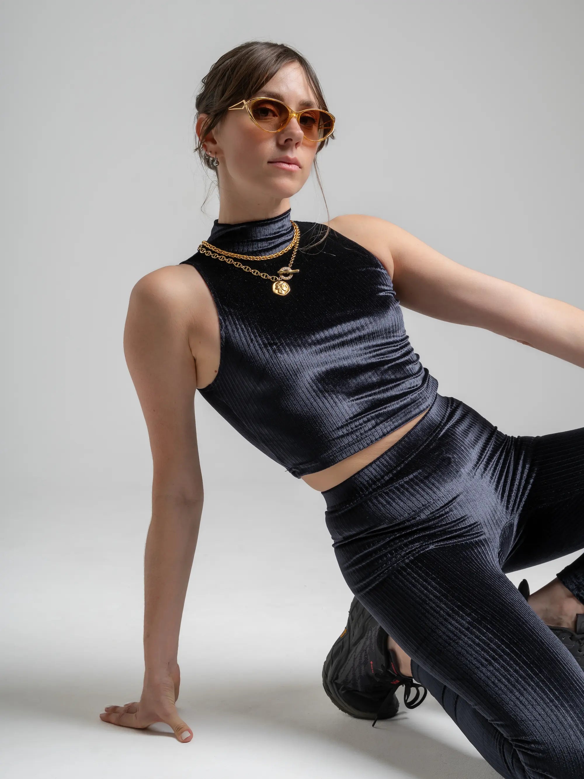 Adopte une élégance intemporelle avec ce top court velours côtelé noir profond. Son col montant raffiné et sa coupe sans manches ajustée mettent en valeur les épaules et sculptent la silhouette avec modernité. Le velours côtelé apporte une texture subtile et une touche vintage irrésistible, tout en restant ultra-doux et agréable à porter.