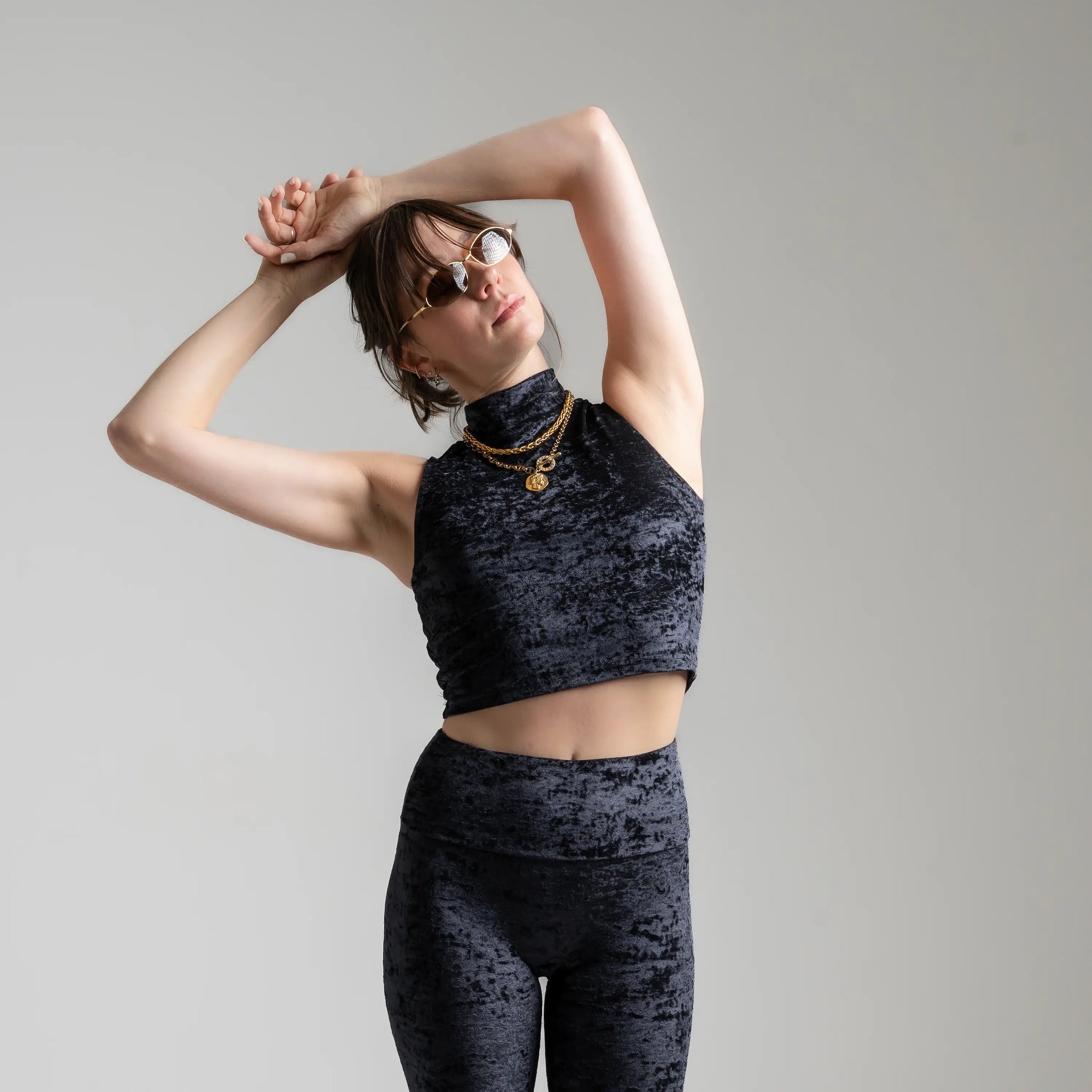 Le top court Velours noir profond est l'allié parfait pour une élégance intemporelle. Son col montant et sa coupe sans manches sculptent la silhouette et valorisent les épaules, tandis que son velours gratté apporte une douceur incomparable.